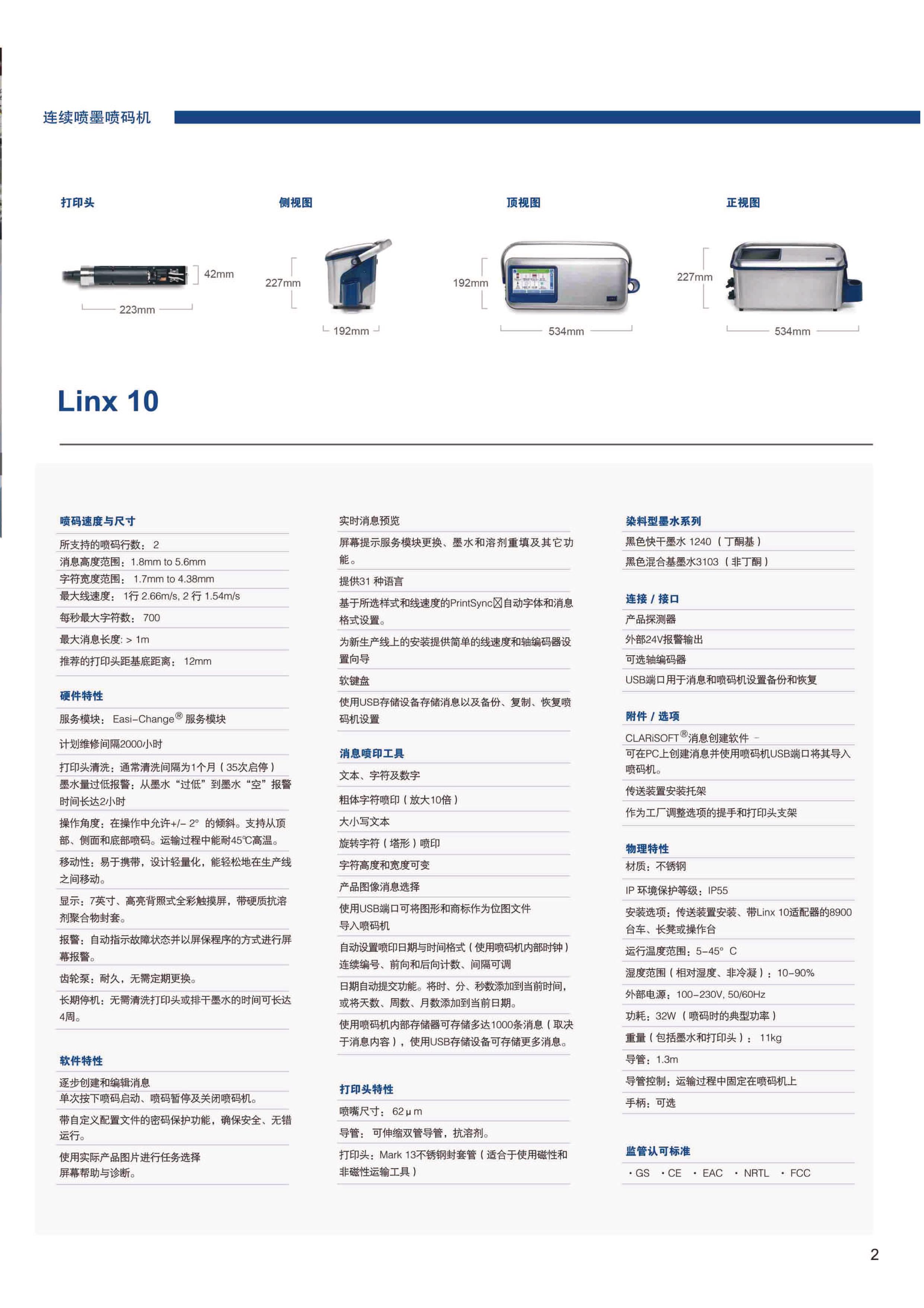 ·有史以来第一次,一台您能在生产线之间轻松移动的连续喷墨打码机 为单条生产设计的Linx 10提供了所有干燥基底上的高品质双行喷码。拥有市场上最小的机身,以便于您能将Linx 10喷码机移动到任何您需要打码的地方。喷码机大小已不是关键。简单的喷码设置实现了迅速且无差错的产品换线,而坚固的设计更为您提供了您预期的高可靠性。