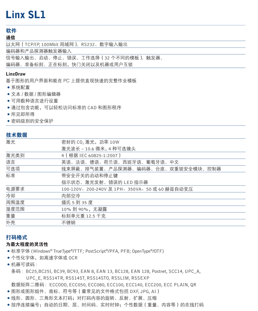 ·Linx SL1是一款具有成本效益的紧凑型打码机,可以很好的集成到空间受限的生产环境中。 •价格实惠的的无需耗材的激光打码 •具有比同等激光打码机更强的可靠性和更长的使用寿命 •将文本、商标和机器可读码混合在一个单独的消息中 •您的包装设计可使用更多字体 •牢固的不锈钢外壳 •可在紧密的生产线之间轻松安装