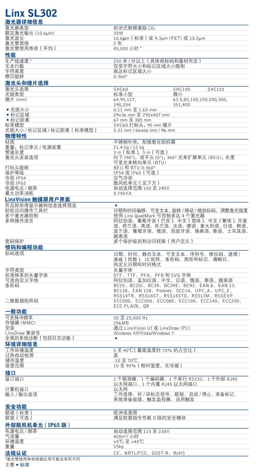 灵活快速• 这款强大的 30W 激光器可以在各种不同材料上进行高品质的文本、图形和数据矩阵打码。• Linx SL 激光器拥有最快的电流计响应时间,可以提供更多的控制和更多的时间来进行打码。• 模块化设计和多光束传输选项,意味着该激光器能够适应最严苛的生产线。• 使用 Linx QuadMark® 可从一个点控制多达 4 个激光器。经济可靠• 拥有市场上使用寿命最长的激光管(45,000 小时),从而降低您的运营成本。• 最广泛的打标头、镜片和激光管选择,可以更好地利用激光,延长激光管使用寿命。• 维护周期通常是行业标准的两倍,从而让您的生产线保持运行更长时间而不中断。• 不像许多其他激光打码机,Linx SL 系列不需要昂贵的工厂空气进行冷却。• 无需与其他打码方式相关的昂贵耗材。• IP54 作为标准,并可以选择 IP65,在充满挑战的环境中获得最大的可靠性和最长的正常运行时间。操作直观• Linx SL 激光打码机配有全新的 LinxVision® 彩色触摸屏,使用方便。• 大型所见即所得显示器可以实现直观的信息创建;清楚地显示要打码的所选信息,减少使用者的错误。• 快速信息预览功能让您可以轻松地浏览信息数据库,确保选择正确的信息。• 一览状态报告让用户能够快速了解激光器的状态,而轻松访问操作工具栏意味着可以快速修改激活的信息。• 独特的安装向导会消除集成过程中的麻烦,一步一步地指导用户,从而减少停机时间。